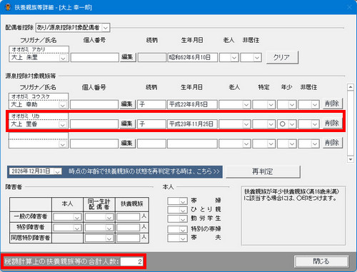 | 入力された生年月日から、本年末日現在で16歳未満の人は年少扶養親族として[年少]欄に「〇」が自動で入り、扶養人数にカウントされません。 |