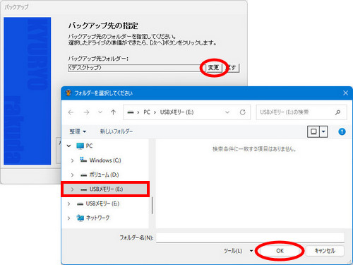| 移行元のコンピューターで、バックアップ機能を使用し、2台のコンピューターで共通して使用できるメディア(USBメモリ等)にバックアップを行います。 |