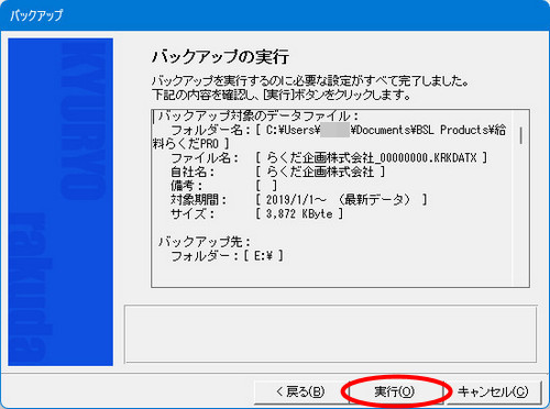 | (1- | 5)[次へ]ボタンをクリックし、「バックアップの実行」画面で、[実行]ボタンをクリックします。 |
