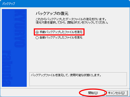 | (2- | 3)「バックアップの復元」画面で、[手動バックアップしたファイルを復元]を選択し、[開始]ボタンをクリックします。 |