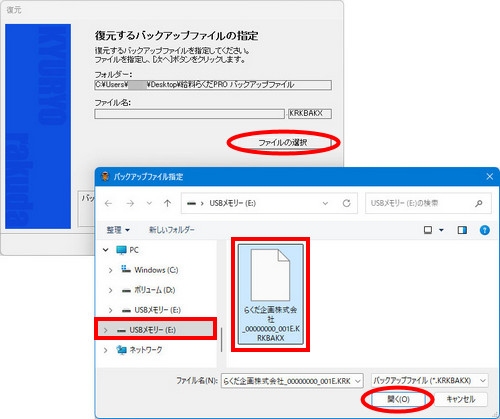 | (2- | 4)「復元するバックアップファイルの指定」画面で、[ファイルの選択]ボタンをクリックして、バックアップファイルが保存されているドライブまたはフォルダーを指定します。ファイルを選択したら、[開く]ボタンをクリックします。 |