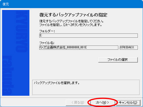 | (2- | 5)[ファイル名]欄にバックアップファイルが表示されていることを確認し、[次へ]ボタンをクリックします。 |