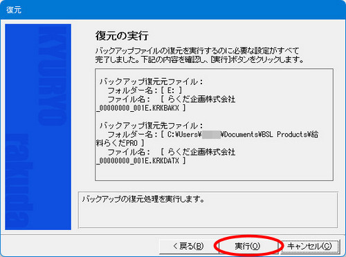 | (2- | 6)「復元の実行」画面で、[実行]ボタンをクリックします。 |