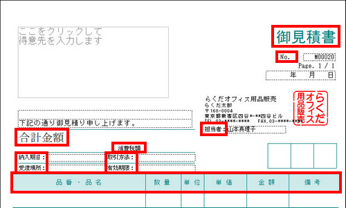 | 例えば、「【単票】A4見積書(A) カラー」の場合、下図の赤枠の部分が編集可能です。 |