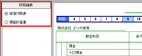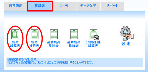 | メインメニューの[集計表]タブ内にある[残高試算表]・[残高推移表]のいずれかを開き、画面左上にある「財務諸表」内で切り替えが可能です。 |