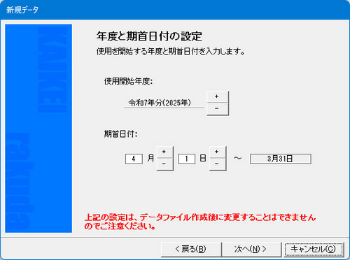 | なお、運用開始後(データファイル作成後)に期首日付を変更することはできません。 |