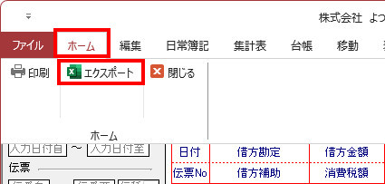 | エクスポートは、「仕訳帳」画面の「ホーム」メニュー→「エクスポート」または、「設定」画面→「データファイル」→[データ出力(エクスポート)]ボタンから行います。 |