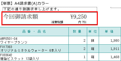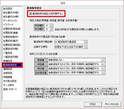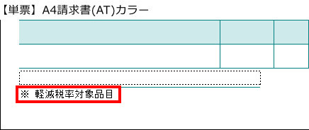 | ・「軽減税率の対象品目である旨の記載」(既定値:「※軽減税率対象品目」)の印字位置が異なります。踏襲元は「備考」欄ですが、専用の場所に表記・印字されます。なお、印字位置は用紙の種類により固定となっており、「設定」画面→「軽減税率設定」内に用意されている「記載する場所」の影響は受けません。 |