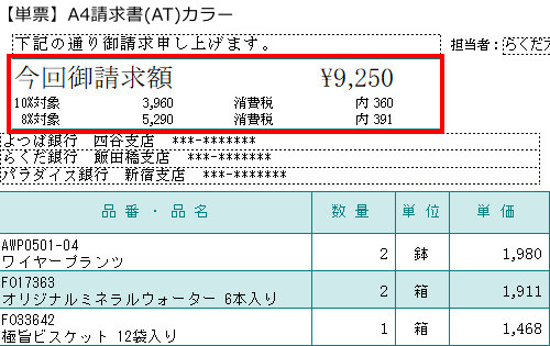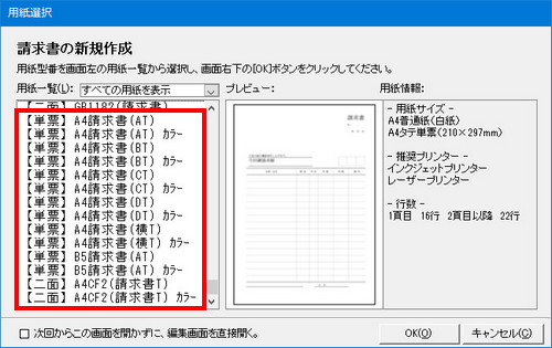 | これにより、軽減税率を使用される方向けの用紙型番が使用可能となり、「見積書」から「合計請求書」までの各伝票種類の「用紙型番」内に、「【単票】A4請求書(AT)」等、"T"と付く用紙型番が追加されます。 |