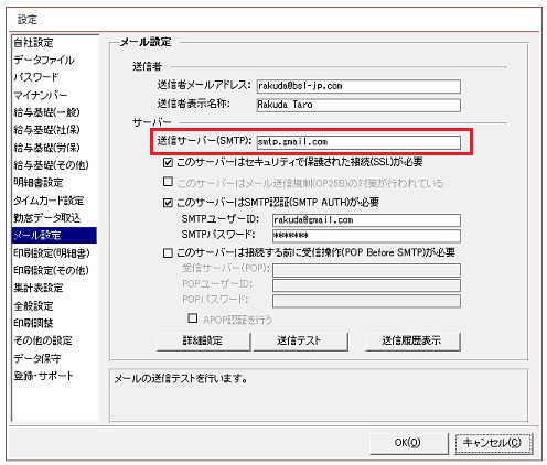 | メインメニューから設定を開き、メール設定をクリックし、送信サーバー(SMTP)の欄を確認します。送信サーバー(SMTP)が「smtp.gmail.com」になっている場合、2022年5月30日以降、明細書のメール送信ができなくなります。 |