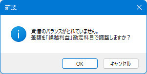 | 「期首残高」画面で「繰越利益」以外の科目の期首残高を入力してから[更新]ボタンを押すと、貸借の差額を繰越利益で調整するか尋ねる「確認」画面が表示されます。[OK]ボタンをクリックすると「繰越利益」の金額が自動計算されます。 |