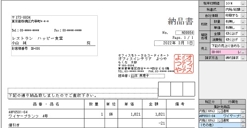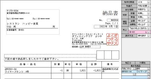 | 値引きの場合は、商品名の欄に「値引き」等の文字を入力し、「金額」欄にマイナス記号「-」を付けて金額を入力してください。 |