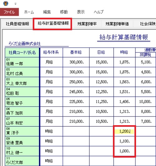 | (2) | [給与計算基礎情報]タブをクリックし、各社員の「時給」欄で直接金額を書き換えて下さい。 |