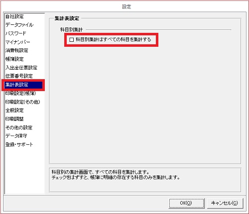 | (2) | [集計表設定]内にある[科目別集計はすべての科目を集計する]のチェックを外します。 |