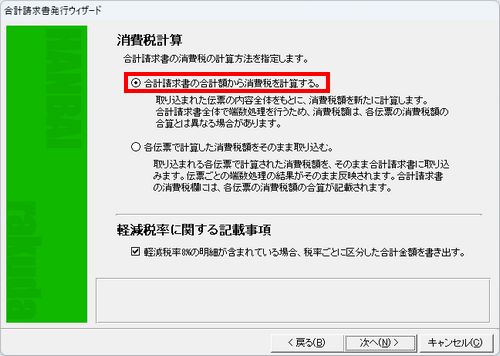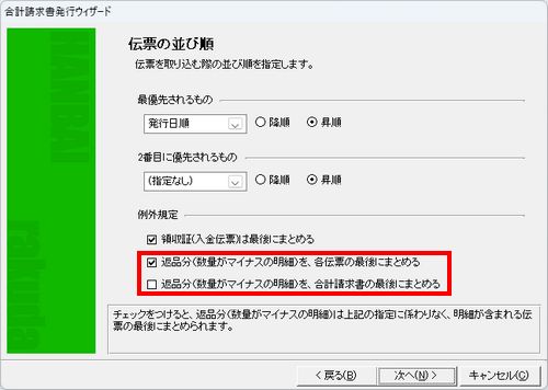 ※「返品分(数量がマイナスの明細)を、合計請求書の最後にまとめる」のチェックボックスは、1つ前の「消費税計算」画面で「合計請求書の合計額から消費税を計算する」を選択している場合のみ表示されます。 |