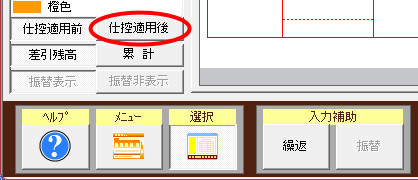 | (2) | 画面左「付箋検索」の下部にある[仕控適用前]・[仕控適用後]ボタンの中から、[仕控適用後]ボタンをクリックして押し下げます。 |