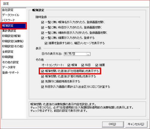 | なお、メインメニューの[設定]アイコン→「設定」画面→「帳簿設定」にある「帳簿を開いた直後は「仕控適用前」を表示する」のチェックがついた状態の場合、帳簿を開き直すと再び[仕控適用前]ボタンが押された状態となります。チェックをはずすと、帳簿画面上での設定が保持されます。 |