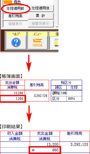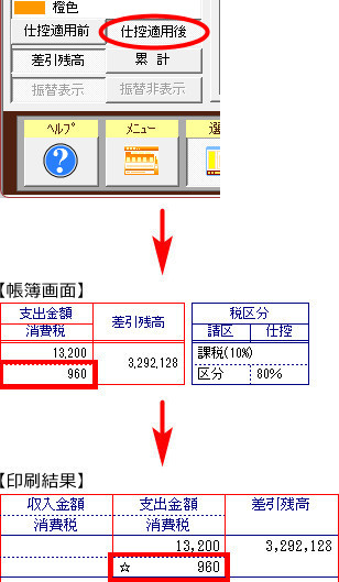 | 帳簿画面で、[仕控適用後]ボタンをクリックした時に表示される「消費税」と、印刷結果の「消費税」が一致することをご確認ください。 |