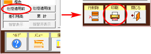 | (1) | 帳簿画面で[仕控適用前]ボタンを押し下げた状態で、[印刷]ボタンをクリックします。 |