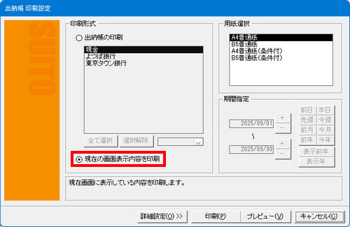 | (2) | 「印刷設定」画面で、「印刷形式」の中から「現在の画面表示内容を印刷」を選択し、「用紙選択」内で用紙を選択します。 |