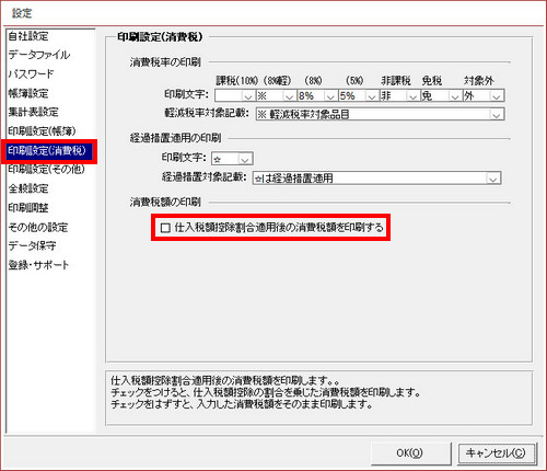 | (2) | 「設定」画面で、「印刷設定(消費税)」内にある「仕入税額控除割合適用後の消費税額を印刷する」のチェックをはずします。 |