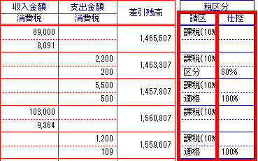 | 帳簿画面の「請区」(請求書区分)・「仕控」(仕入控除)には、明細の日付・科目・金額をもとに適切と思われる値が自動的に入力されます。 |