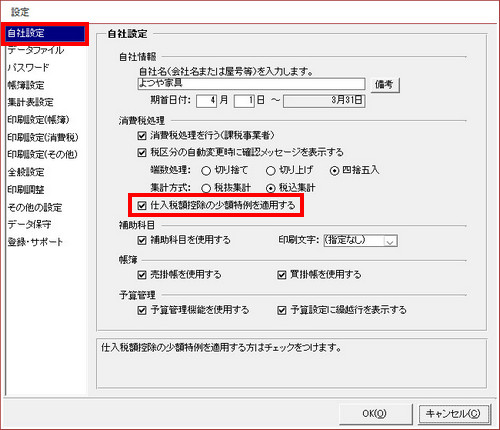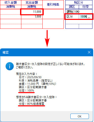 | ただし、初期設定では少額特例が適用されないため、「仕控」を「100%」に手動で変更する必要があり、変更した場合、確認メッセージが表示されます。 |