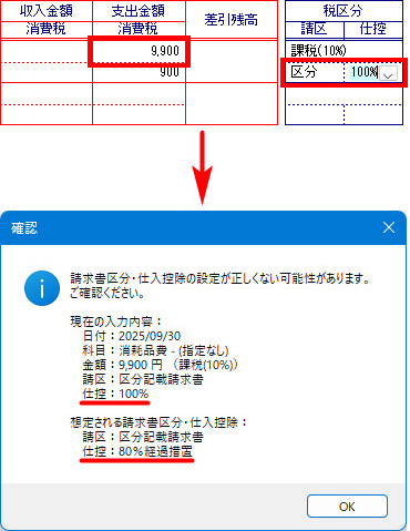 | 「請求書区分・仕入控除の設定が正しくない可能性があります。」というメッセージが表示されます。 |