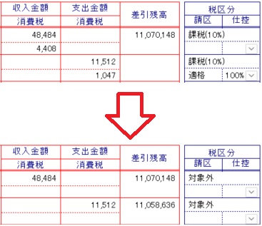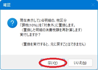 | (14) | 置換後の各明細の[税区分]が「対象外」に変わっていることをご確認ください。 |