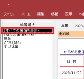 | (4) | 画面左下の[選択]ボタンを押し下げ、画面左上に表示される「帳簿選択」の中から「(すべての帳簿を表示)」を選択します。 |