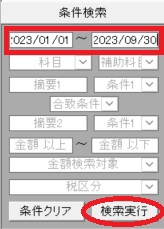 | (6) | 「条件検索」の日付欄で「2023/01/01」〜「2023/09/30」と入力し、[検索実行]ボタンを押します。 |