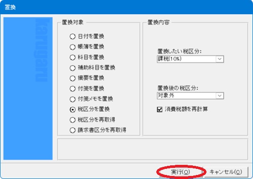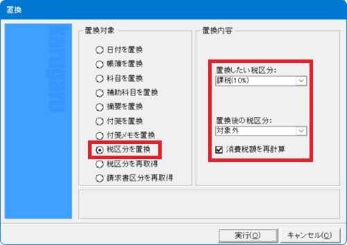 | (9) | 「置換」画面が表示されますので、「置換対象」から[税区分を置換]を選択します。さらに、「置換内容」の中を[置換したい税区分:課税(10%)]、[置換後の税区分:対象外]とします。また、対象明細の[消費税]の金額を、税率に合わせて再計算したい場合は、[消費税額を再計算]にチェックを付けます。 |