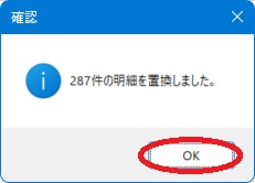 | (13) | 「○件の明細を置換しました。」という確認メッセージが表示されますので、[OK]ボタンをクリックします。 |