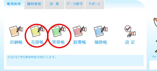 | (15) | 「かるがるできる青色申告2015」以降や「出納らくだ7」以降をお使いで、売掛帳や買掛帳にもデータをご入力頂いている場合は、[売掛帳]アイコンや[買掛帳]アイコンでも同じ作業を行ってください。 |
