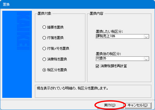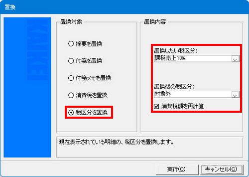 | (4) | 「置換」画面が表示されますので、「置換対象」から[税区分を置換]を選択します。さらに、「置換内容」の中を[置換したい税区分:課税売上(10%)]、[置換後の税区分:対象外]とします。また、対象仕訳の[消費税額]の金額を、税率に合わせて再計算したい場合は、[消費税額を再計算]にチェックをつけます。 |