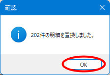 | (8) | 「○件の明細を置換しました。」という確認メッセージが表示されますので、[OK]ボタンをクリックします。 |