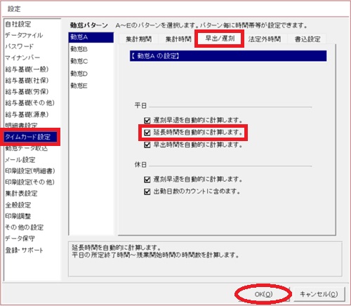 | (2) | [タイムカード設定]ー[早出/遅刻]タブ内にある「延長時間を自動的に計算します。」のチェックボックスにチェックを入れ、[OK]ボタンをクリックして「設定」画面を閉じます。 |