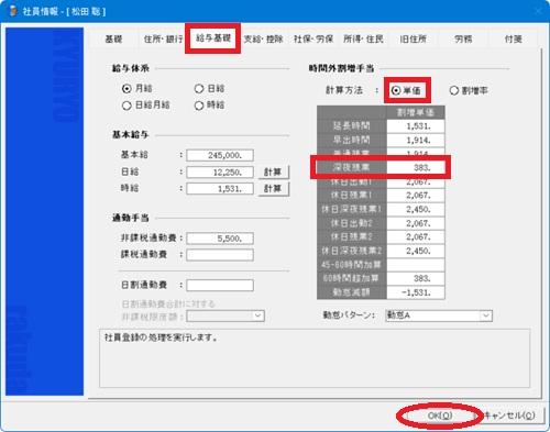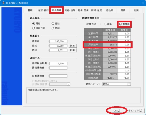 | ●「社員情報」画面内で「深夜残業」の割増率を変更する。 |