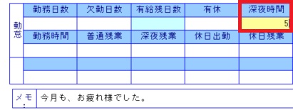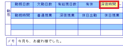 | ※「深夜時間」には深夜の所定労働時間のみ入力します。深夜の所定労働を超えた残業時間は、「残業時間」と「深夜残業」にそれぞれ入力してください。 |