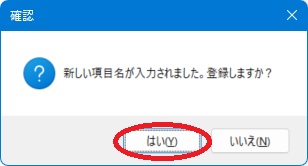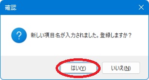 | (5) | (「新しい項目が入力されました。登録しますか?」というメッセージが表示されますので、[はい]ボタンをクリックします。 |