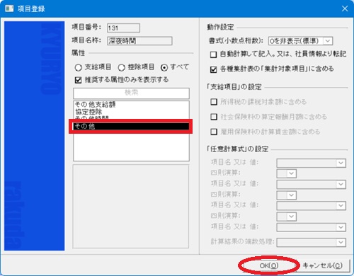 | (6) | 「項目登録」画面が表示されますので、[属性]の中から「その他」を選択し、[OK]ボタンをクリックします。 |