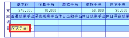 | (7) | 支給項目の空いている項目名欄をクリックし、「深夜手当」と入力して、[Enter]キーで確定します。(項目の名称は任意) |