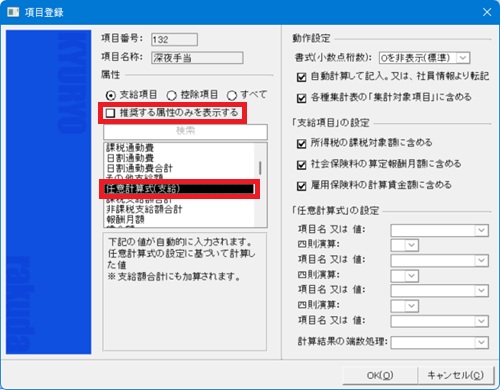 | (9) | 「項目登録」画面が表示されますので、[属性]の中から[推奨する属性のみを表示する]のチェックを外し、「任意計算式(支給)」を選択します。 |