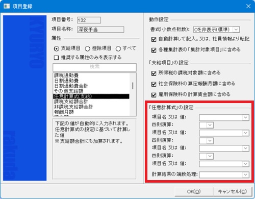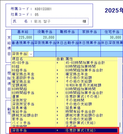 | ●任意計算式を使って「深夜時間」と「深夜手当」の項目を作成する。 |