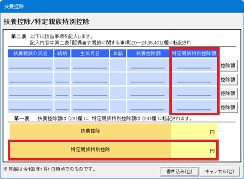 | 第一表の「扶養控除/特定親族特別控除」画面に「特定親族特別控除額」欄が新設されています。 |