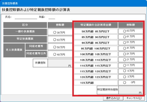 | [控除額]ボタンを押すと表示されるポップアップ画面で「特定親族の合計所得金額」欄が新設され、合計所得に応じて控除額が選択できるようになりました。 |