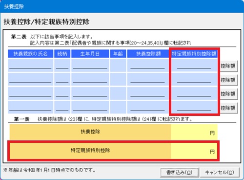 | 第一表の「扶養控除/特定親族特別控除」画面に「特定親族特別控除額」欄が新設されています。 |
