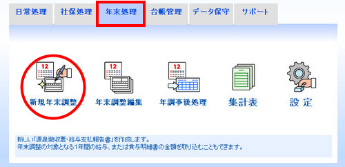 | (1) | メインメニューの[年末処理]タブをクリックし、[新規年末調整]アイコンをクリックします。 |