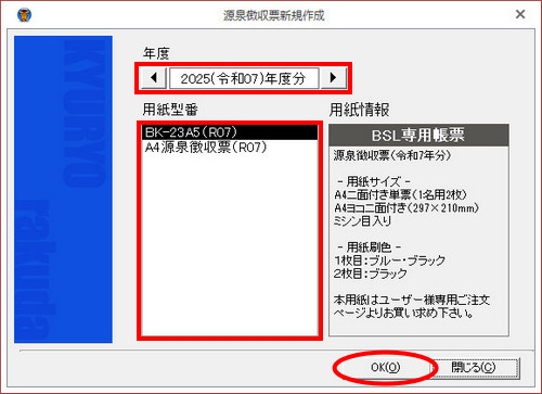 | (2) | 「年度」および「用紙型番」を選択し、[OK]ボタンをクリックします。 |