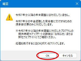| ※令和7年分の年末調整に対応していない製品の場合、下図のようなメッセージが表示されます。退職者の源泉徴収票を作成する場合は、[OK]ボタンをクリックしてください。 |